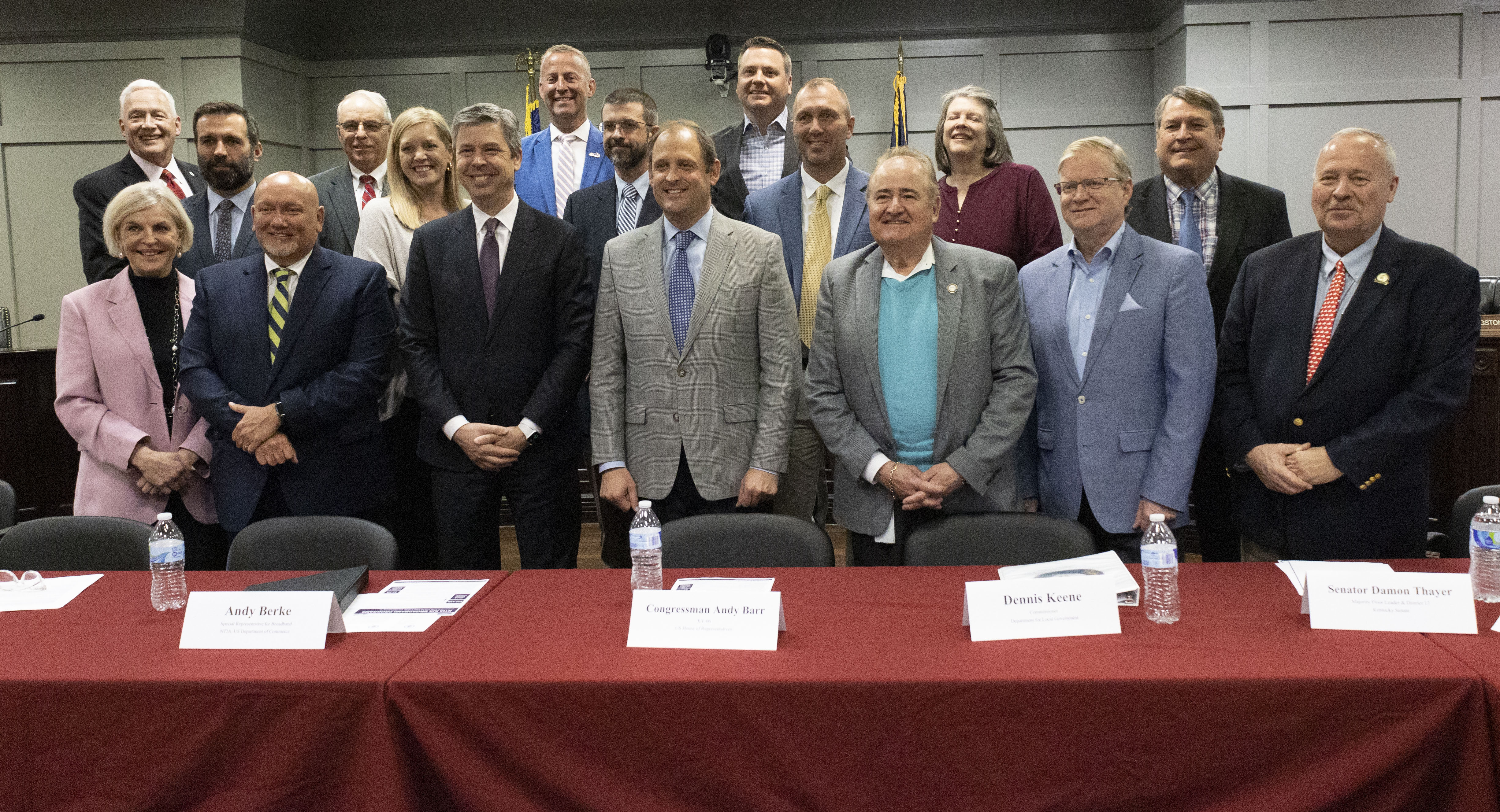 Photo caption: Roundtable participants included, front row from left: Mary Pat Regan, deputy secretary of Education and Workforce Development; Joe Pat Covington, Scott County judge/executive; Andy Berke, special representative for Broadband; Congressman Andy Barr; Dennis Keene, Department for Local Government commissioner; Sen. Damon Thayer and Rep. Phillip Pratt. On the second row from left are Ben U’sellis, Charter Communications director of government affairs; Stephanie Nelson, field representative; Billy Parker, Scott County school district superintendent; Dwayne Ellison, District 5 magistrate; Patti Burnside, Scott County Public Library executive director; and Rick Hostetler, District 1 magistrate. In back from left are: Georgetown Mayor Tom Prather, Alvin Lyons, District 2 magistrate; David Livingston, District 7 magistrate; and Tim Thompson, District 6 magistrate.