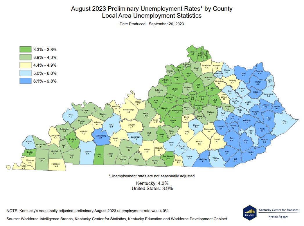 Kentucky’s county unemployment rates and employment levels are not seasonally adjusted because of small sample sizes. Employment statistics undergo sharp fluctuations due to seasonal events such as weather changes, harvests, holidays, and school openings and closings. Seasonal adjustments eliminate these influences and make it easier to observe statistical trends. The comparable, unadjusted unemployment rate for the state was 4.3% for August 2023, and 3.9% for the nation.