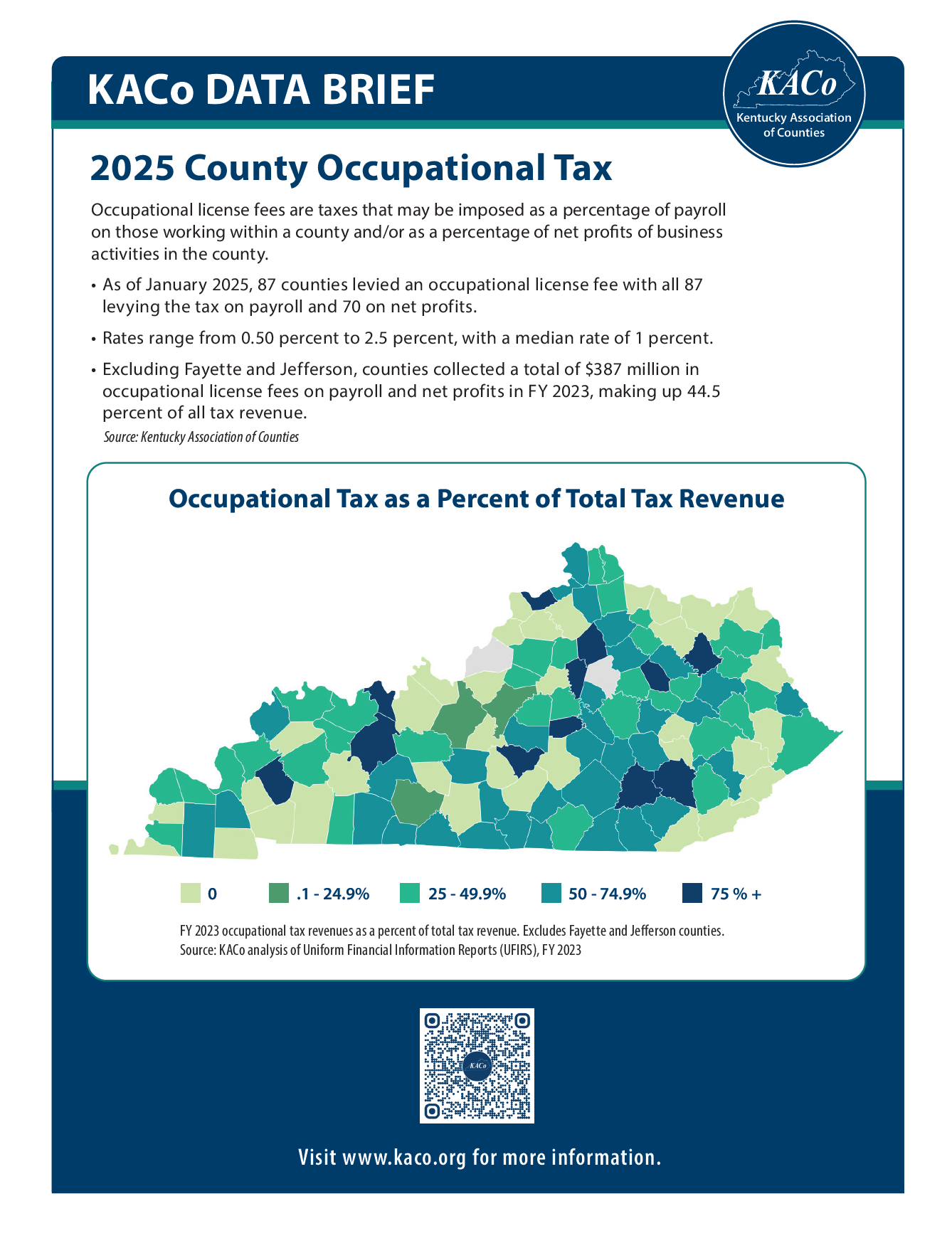- Excluding Fayette and Jefferson, counties collected a total of $387 million in occupational license fees on payroll and net profits in FY 2023, making up 44.5 percent of all tax revenue.