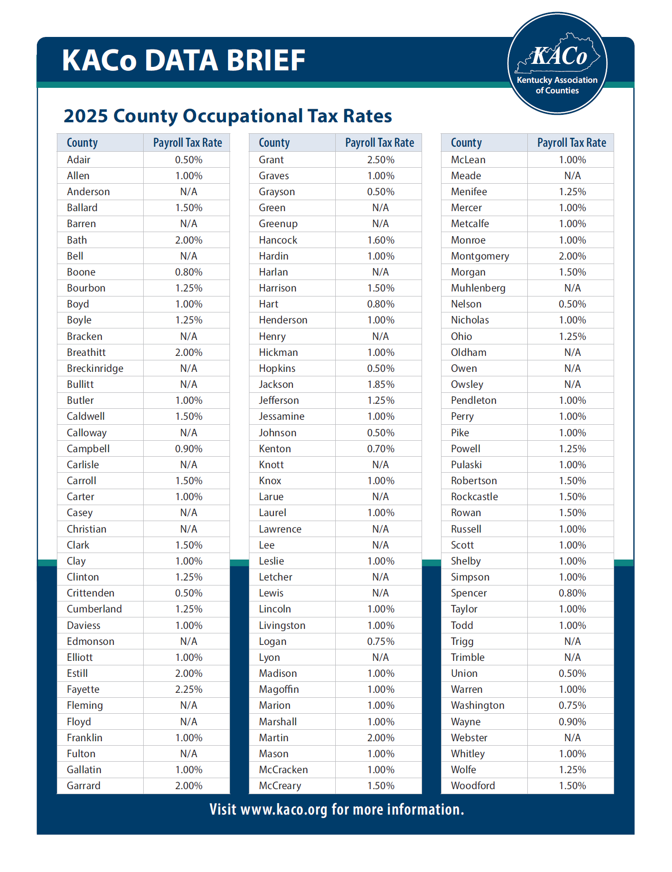 - As of January 2025, 87 counties levied an occupational license fee with all 87 levying the tax on payroll and 70 on net profits.