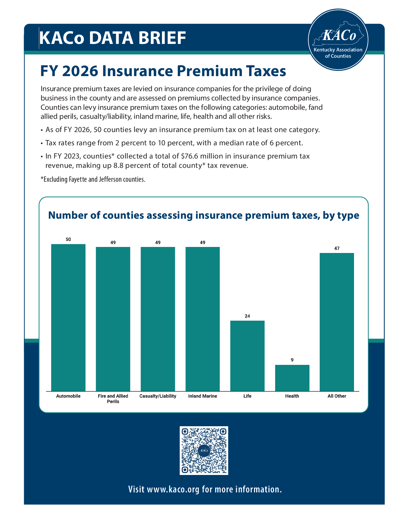 - As of FY 2026, 50 counties levy an insurance premium tax on at least one category.