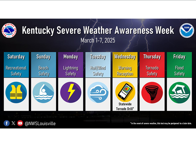 Traditionally considered the start of severe weather season in Kentucky, March 1-7 is Kentucky Severe Weather Awareness Week. In conjunction with this week, the National Weather Service (NWS) will conduct the Statewide Tornado Drill, Friday, March 7, at 10:07 a.m. ET / 9:07 a.m. CT (NOTE: The drill was rescheduled from Wed. March 5 due to the weather forecast.)