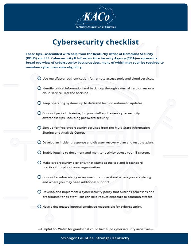 These tips - assembled with help from the Kentucky Office of Homeland Security (KOHS) and U.S. Cybersecurity & Infrastructure Security Agency (CISA) - represent a broad overview of cybersecurity best practices, many of which may soon be required to maintain cyber insurance eligibility.