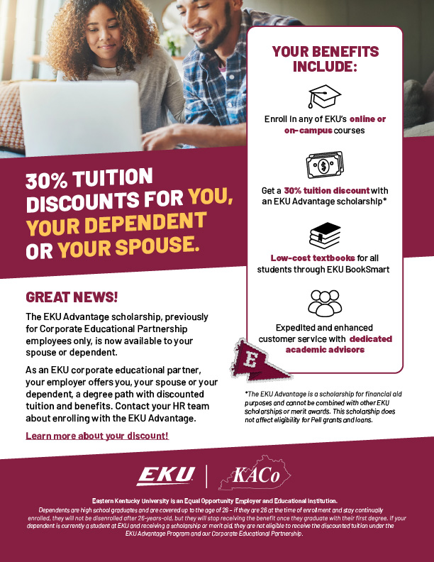 Eligible county employees, their spouses and dependents can receive 30% discounted tuition through a historic partnership between Eastern Kentucky University and KACo.