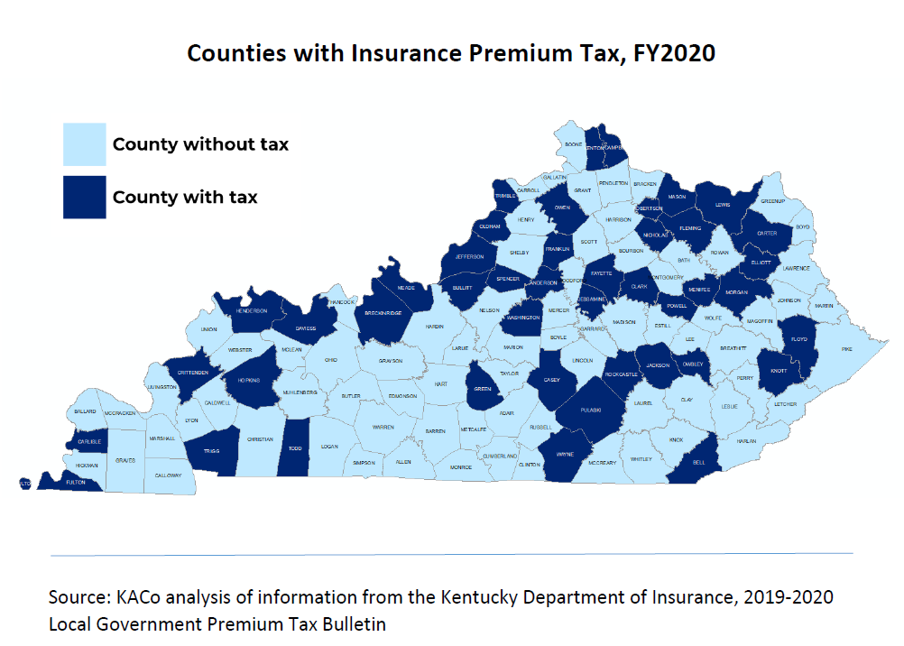 Forty-four counties have an insurance premium tax for fiscal year 2020 in at least one category (fire, casualty/liability, vehicle, inland marine, health, life or other risks).
